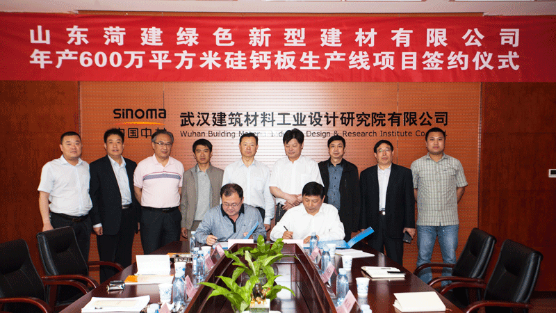 2015年4月25日,武漢院有限公司同山東菏澤綠色新型建材有限公司就硅鈣板生產(chǎn)線項(xiàng)目簽訂合作協(xié)議。武漢院有限公司董事長姚元君,副總經(jīng)理郭超,楊順德出席簽約儀式。