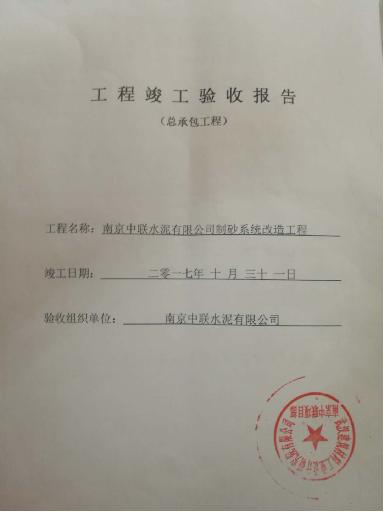 2018年1月18日,由我院總承包的“南京中聯(lián)水泥有限公司制砂系統(tǒng)改造工程”順利通過性能測試,完成竣工驗收,工程合格率100%,顆粒級配符合國家標(biāo)準(zhǔn),工藝系統(tǒng)滿足業(yè)主要求。