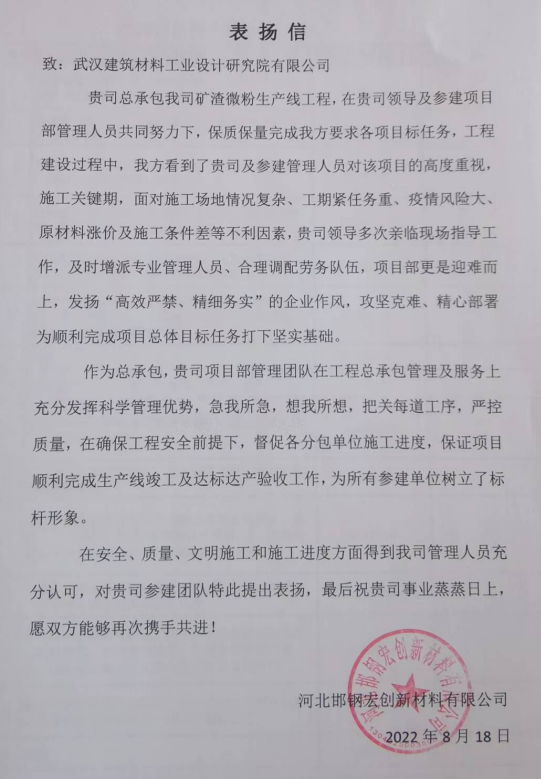 邯鋼工業(yè)園礦渣微粉生產(chǎn)線實(shí)現(xiàn)了產(chǎn)品質(zhì)量好、能耗電耗低的美好目標(biāo),并且環(huán)保、安全標(biāo)準(zhǔn)均達(dá)到行業(yè)領(lǐng)先水平,創(chuàng)造了良好的社會(huì)經(jīng)濟(jì)效益,向業(yè)主方交出了滿意的答卷。為了感謝武漢建材院的付出,河北邯鋼宏創(chuàng)新材料有限公司特地發(fā)來了表揚(yáng)信。